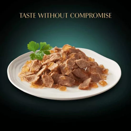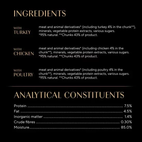 Összetevők: Csirkével: hús és állati származékok (44%, ebből 4% csirke), válogatott gabonafélék, ásványi anyagok, különféle cukrok Baromfival: hús és állati származékok (44%, ebből 4% baromfi), válogatott gabonafélék, ásványi anyagok, különféle cukrok Pulykával: hús és állati származékok (44%, ebből 4% pulyka), válogatott gabonafélék, ásványi anyagok, különféle cukrok Analitikai összetevők: Fehérje 8%, zsír 4,5%, szervetlen anyag 1,8%, nyersrost 0,3%, nedvesség 83%. Tápértékkel rendelkező adalékanyagok: kálcium-jodát (vízmentes) 0,32 mg, réz-szulfát pentahidrát 4,9 mg, vas-szulfát monohidrát 33,4 mg, mangán-szulfát monohidrát 6,3 mg, cink-szulfát monohidrát 44 mg. Etetési útmutató: Egy átlagos testsúlyú (4 kg) macskának napi 250 g alutasakos eledelre van szüksége. Étrendváltáskor érdemes bizonyos átállási időt hagyni, hogy kedvence alkalmazkodjon az új eledelhez. Átlagosnál nagyobb testsúlyú macska esetén csökkentse a napi etetési mennyiséget. Mindig gondoskodjon megfelelő mennyiségű ivóvízről kisállata számára. Szobahőmérsékleten tálalva a legfinomabb.