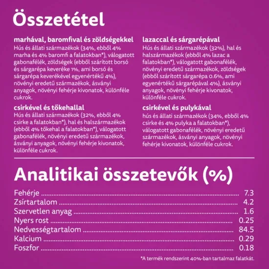 Összetétel: hús és állati származékok (32%, ebből 4% csirke a falatokban*), hal és halszármazékok (ebből 4% tőkehal a falatokban*), válogatott gabonafélék, növényi eredetű származékok, ásványi anyagok, növényi fehérje kivonatok, különféle cukrok. *A termék rendszerint 40%-ban tartalmaz falatkát.