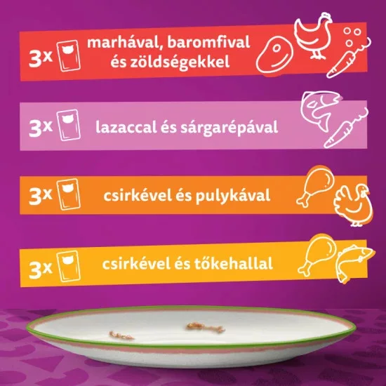Négy szenzációs receptet tartalmaz, melyeket macskaséfjeink válogattak ki: marha baromfi kerti zöldségekkel, lazac sárgarépa, csirke fehérhal, fehérhal kerti zöldségek.