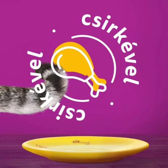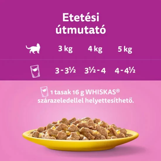 Összetevők Hús és állati származékok (ebből 4% csirkehús), Ásványi anyagok, Különféle cukrok Analitikai összetevők: Fehérje 8%, zsír 4,7%, szervetlen anyagok 1,8%, nyersrost 0,3%, nedvesség 84%. Tápértékkel rendelkező adalékanyagok: B1-vitamin 28,6 mg, D3-vitamin 250NE, E-vitamin 19 mg, kalcium-jodát (vízmentes) 0,3mg, réz-szulfát pentahidrát 10 mg, vas-szulfát monohidrát 31,7 mg , mangán-szulfát monohidrát 5,9mg, cink-szulfát monohidrát 41,8mg. Technológiai adalékanyagok: Kasszia gumi 2370 mg Etetési javaslat: Egy átlagos testsúlyú (4 kg) macskának 3 alutasakos eledelre van szüksége naponta. Etesse kedvencét vegyesen 2 alutasakos és 20 g Whiskas® szárazeledellel. Étrendváltáskor érdemes bizonyos átállási időt hagyni, hogy kedvence alkalmazkodjon az új eledelhez. Az etetési mennyiség kialakításakor vegye figyelembe macskája igényét. Átlagosnál nagyobb testsúlyú macska esetében csökkentse a napi etetési mennyiséget. Mindig gondoskodjon megfelelő mennyiségű friss ivóvízről kisállata számára. Szobahőmérsékleten tálalva a legfinomabb.
